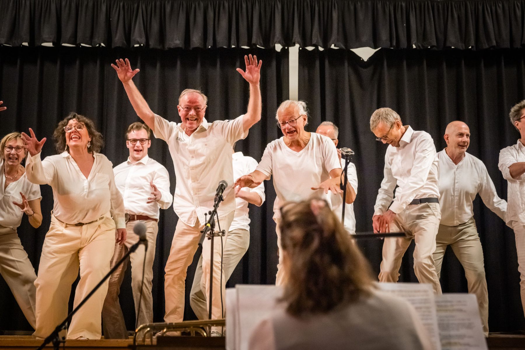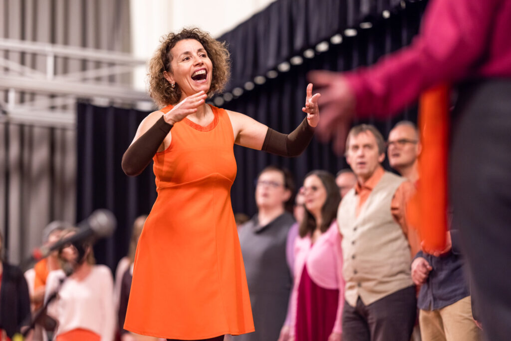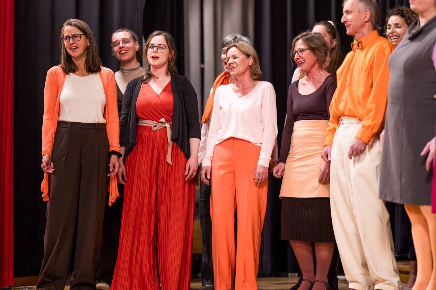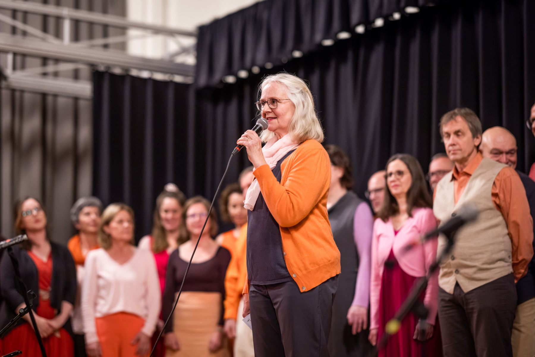 Unsere Chorleiterin Barbara Beckmann dürfte vielen als Komponistin des Fortuna-Musicals in Erinnerung sein und ist ein fester Bestandteil der Düsseldorfer Musikszene. Einst war sie Pianistin im Düsseldorfer Kommödchen, dann ist sie mit dem eigenen Kabarett-Duo auf den Bühnen des Landes aufgetreten. Schließlich hat sie sich einen Traum erfüllt, die Ausbildung zur Chorleiterin absolviert und sich von großen Namen, wie Bobby McFerrin, inspirieren lassen. Vor mehr als zwanzig Jahren hat sie die Soulville Jazz Singers ins Leben gerufen, die sie als ihr Herzensprojekt bezeichnet und die seitdem aus der Düsseldorfer Chorszene nicht mehr wegzudenken sind. Doch dabei ist es nicht geblieben. Die Leitung weiterer Chöre ist dazu gekommen und am 15. November 2025 traten die drei Chöre erstmalig gemeinsam auf in der Aula der Städtischen Flora-Realschule.