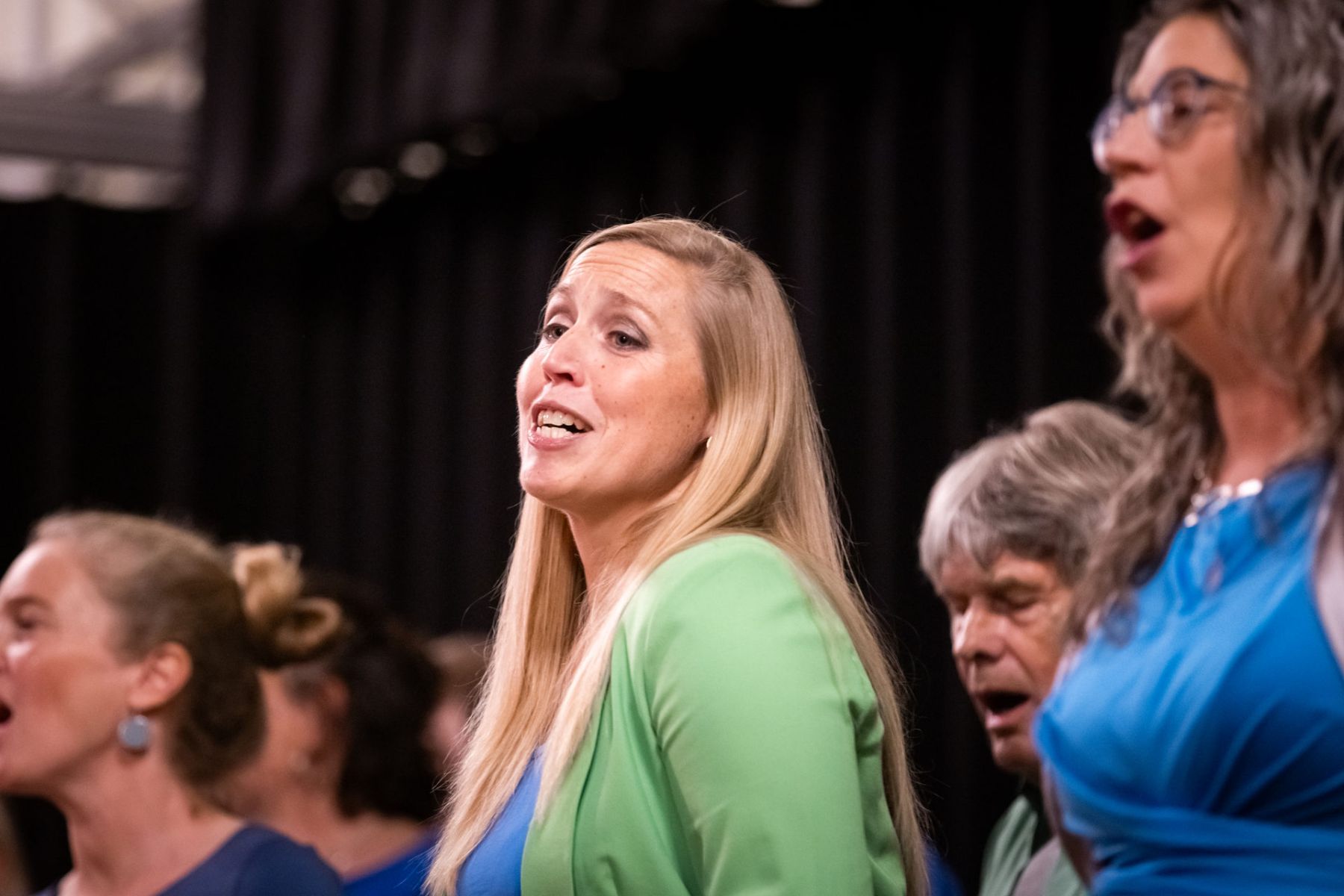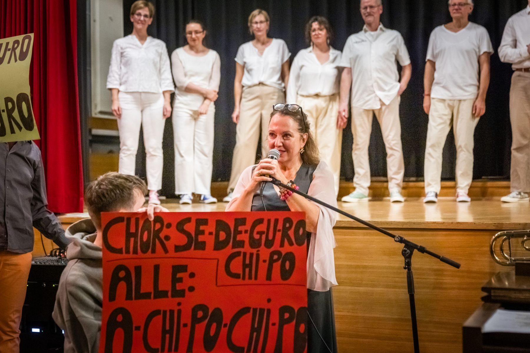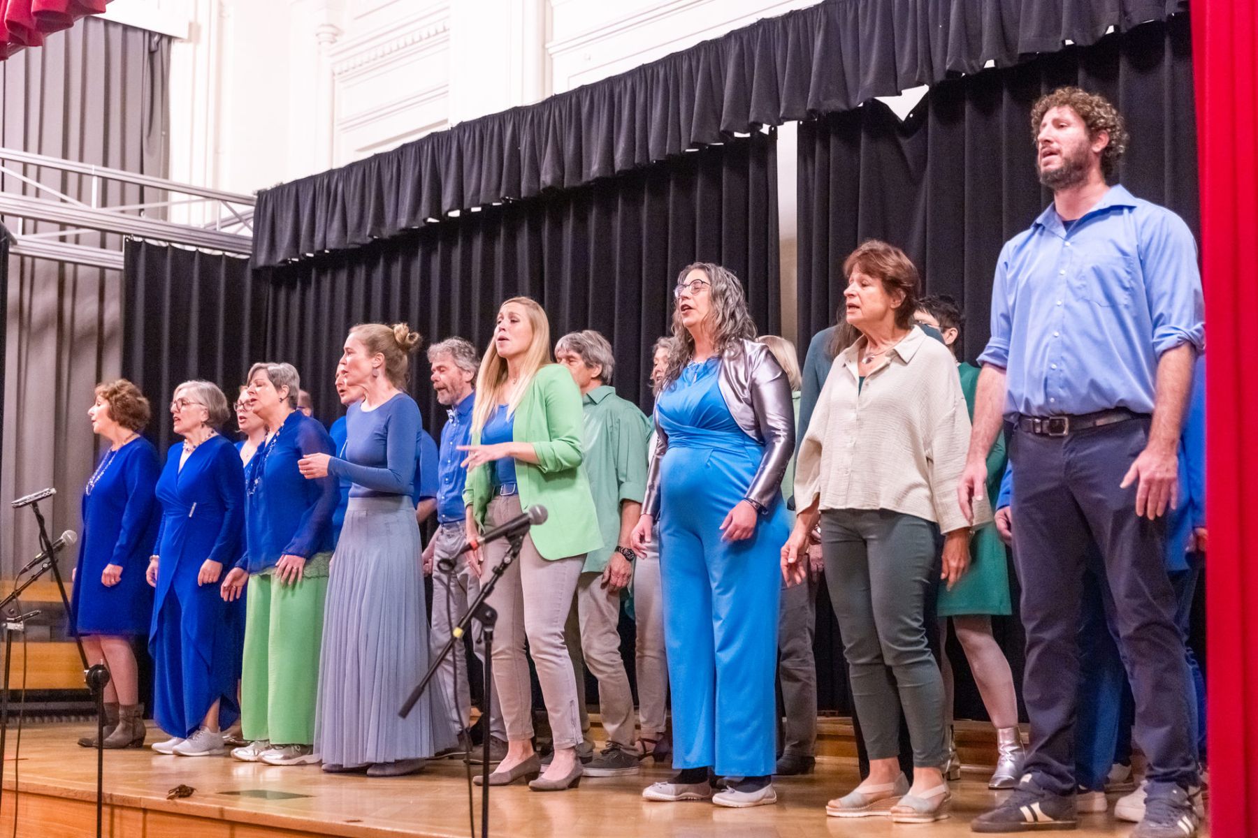 Unsere Chorleiterin Barbara Beckmann dürfte vielen als Komponistin des Fortuna-Musicals in Erinnerung sein und ist ein fester Bestandteil der Düsseldorfer Musikszene. Einst war sie Pianistin im Düsseldorfer Kommödchen, dann ist sie mit dem eigenen Kabarett-Duo auf den Bühnen des Landes aufgetreten. Schließlich hat sie sich einen Traum erfüllt, die Ausbildung zur Chorleiterin absolviert und sich von großen Namen, wie Bobby McFerrin, inspirieren lassen. Vor mehr als zwanzig Jahren hat sie die Soulville Jazz Singers ins Leben gerufen, die sie als ihr Herzensprojekt bezeichnet und die seitdem aus der Düsseldorfer Chorszene nicht mehr wegzudenken sind. Doch dabei ist es nicht geblieben. Die Leitung weiterer Chöre ist dazu gekommen und am 15. November 2025 traten die drei Chöre erstmalig gemeinsam auf in der Aula der Städtischen Flora-Realschule.